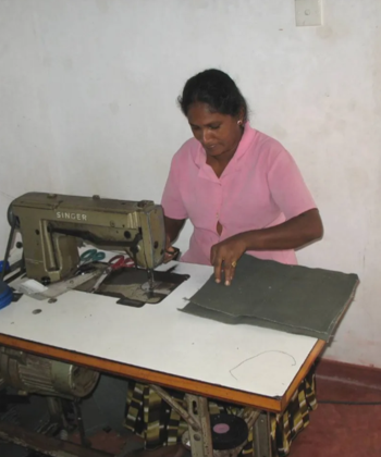 Mevrouw heeft eerst een microkrediet gehad om naaiwerk thuis te kunnen doen, zodat ze een klein inkomen had.